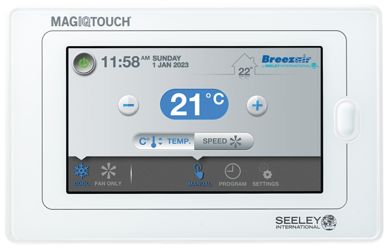 Touch screen controller. PIN access available Ability to control up to 60 coolers. Program mode (7-day, 4 time period program). Allows connectivity to External air sensor. Allows connectivity to Remote indoor temperature sensor and External Air Sensor.