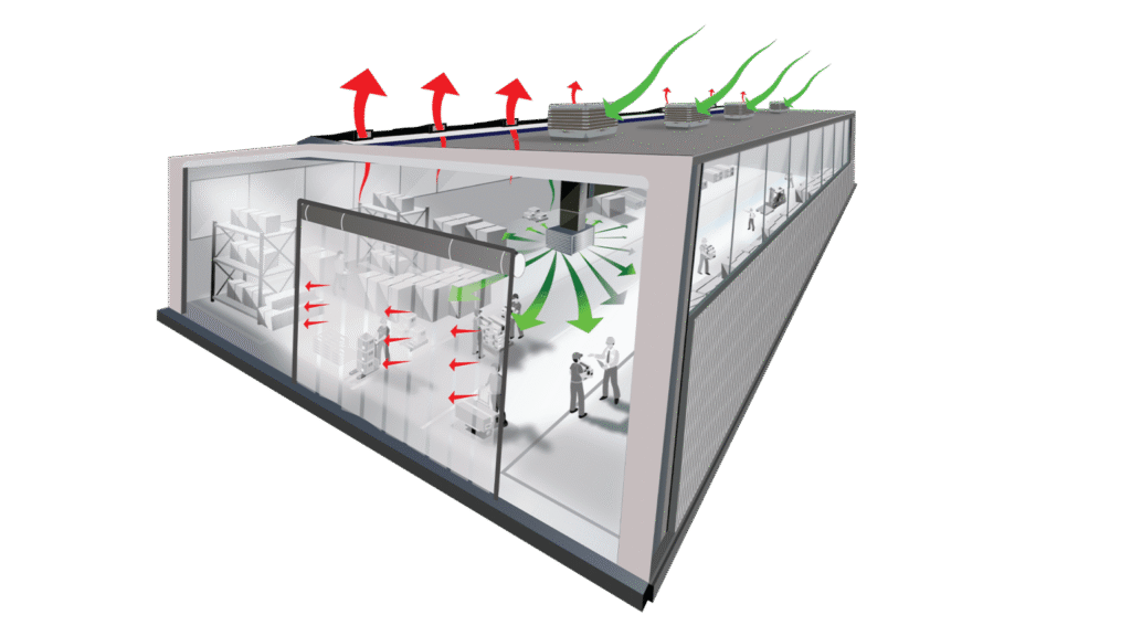 Ansa commercial cooling systems are designed to deliver reliable, high-performance climate control for large commercial and industrial environments. The system draws in air, filters it, and processes it through advanced cooling technology before evenly distributing fresh, comfortable air across wide open spaces. This ensures consistent temperature control, improved air quality, and efficient operation throughout long working hours.